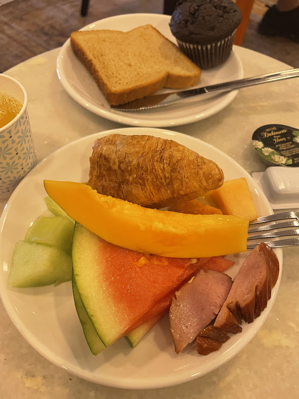 무료라고 해서 그냥 지나칠법한 것들이 하나도 없습니다. 와이파이는 당연히? 무료입니다. (그런데 무료로 제공한다고 강조해 놓았더라고요) 조식이 무료로 제공이 되는데 생각보다 퀄리티가 괜찮았습니다. 하와이에는 맛집들이 많은데요, 아침에 간단하게 요기를 하고 커피, 차 한잔하기에는 부족함이 없는 조식입니다. 많은 곳들이 조식에 추가 요금을 받거나 비싼 비용에 다소 과한 조식을 제공하는 반면 이곳은 빵, 과일, 우유, 치즈, 햄 등 아침으로 간단하게 먹을 수 있을 정도만 딱 조식으로 제공합니다. 물론 메뉴가 거의 비슷하기 때문에 오랫동안 먹으면 지겨울 수 있지만요. 조식의 수준은 대략 아래 사진을 참고하시면 됩니다.
