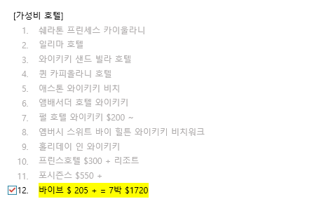 카페나 구글링을 통해서 와이키키에서 가까운 가성비 호텔들을 당시에 찾아보았습니다. 아래 호텔 중에서는 가성비라고 하기에 어려운 곳도 있지만 대부분은 와이키키에서 가성비 호텔로 예약이 일찍 차는 숙소입니다. 결론적으로 바이브 호텔 와이키키(VIVE Hotel Waikiki)에서 하와이의 모든 일정(7박)을 하기로 결정을 했고 하루 $205 총 7박에 $1,720을 숙박료로 지불하였습니다. 우리나라 돈으로 약 230만 원 정도 되는 가격으로 나름 일주일 동안 저렴하게 묶었습니다. (물론 리조트 fee, Tax는 따로 지불을 하셔야 합니다)